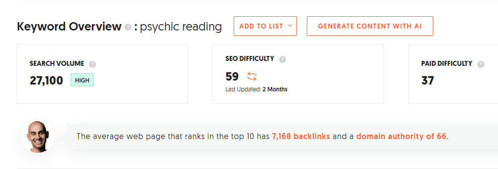 For example, if you wanted to create a website about psychic reading, you could research for it and found out that the search volume is high (27,100) and so is the SEO difficulty (59). You would need more than 7,000 backlinks to rank in the top 10 search results pages.