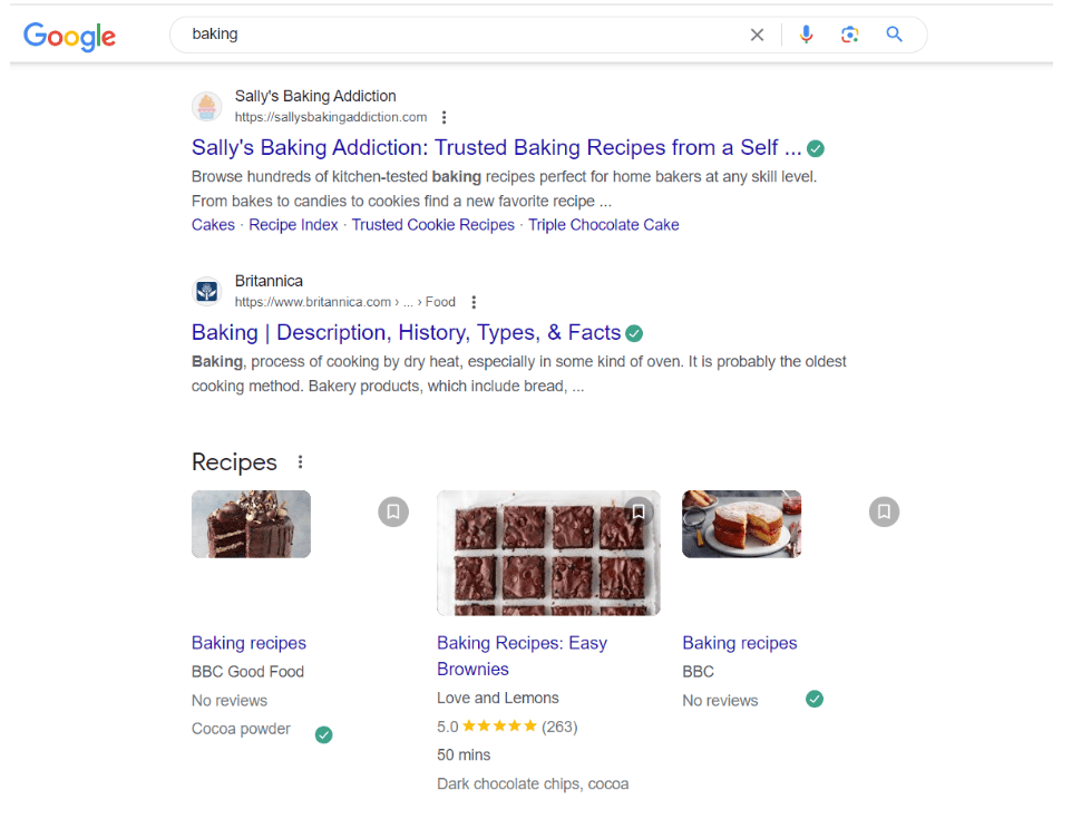 When you search for a recipe like “chocolate chip cookies recipe,” the search results often display not just the link to the recipe but also additional details like ratings, reviews, cooking time, and ingredients.