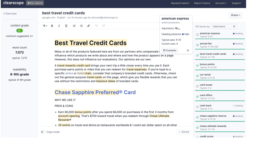 You can also tools like Clearscope and Surfer SEO to optimize content for readability and relevance. These tools analyze top-ranking pages and provide recommendations on keyword usage, content structure, and readability improvements.