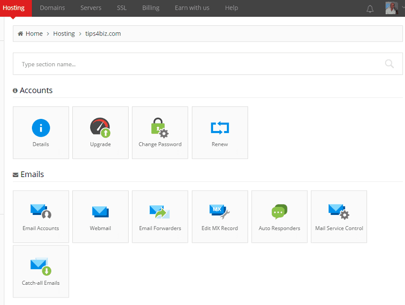 Here is where you can access directly to your hosting account and domains, together with the VPS and SSL features. You can add new orders from here.