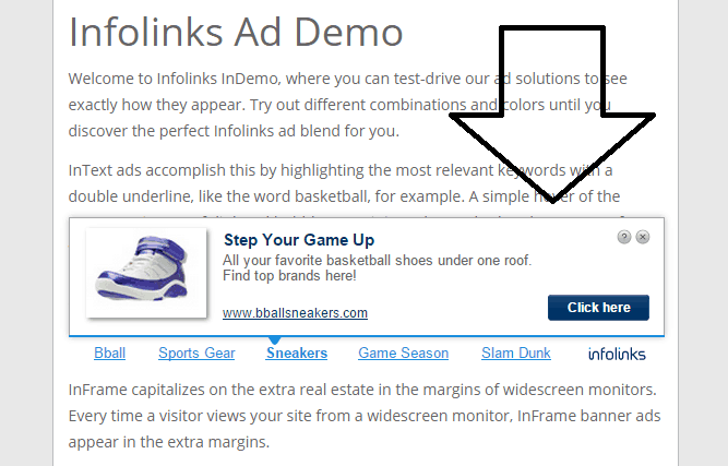 Intext ads will be displayed as hyperlinked text within your content, showing up when users are hovering the mouse over it.