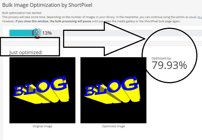 The process may take some time, depending on the number of images in your library. In the meantime, you can continue using your WP admin as usual, in a different browser window or tab (however, if you close this window, the bulk processing will pause until you open the media gallery or the ShortPixel bulk page again).