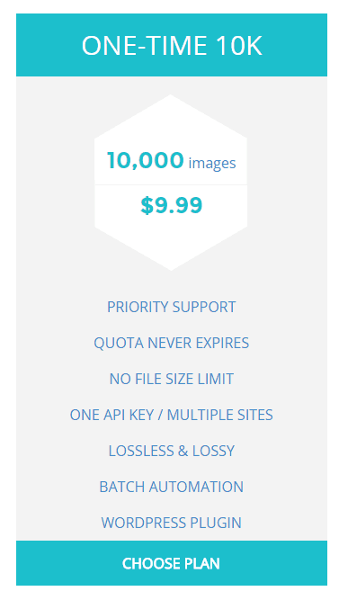 With as little as $9,99 (one-time payment), you get a total of 10,000 credits to use for compressing your site images.