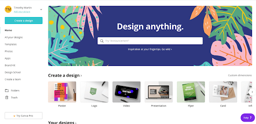 Canva is a graphic design tool offering a wide range of design options. The platform enables you to design images, posts, make videos, create PDFs, logos, certificates, brochures, invitations and more.