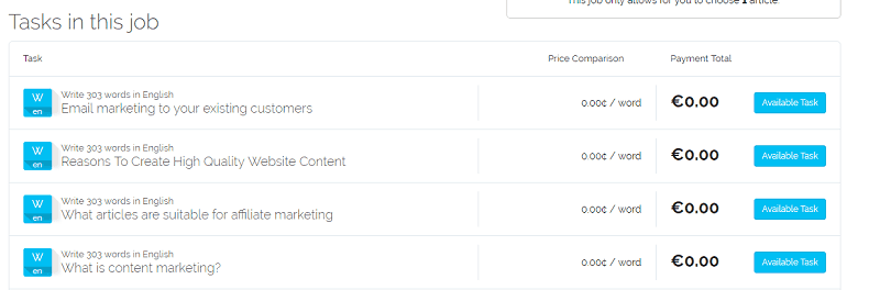 The Tasks section of your dashboard is where you can find job opportunities. The first task you want to complete is to write an article on one of the topics below: