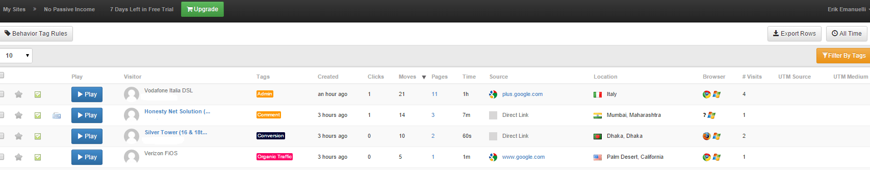 Additional information is displayed like I.P., number of clicks, moves or pages visited, time spent on your site, source, location, and browser/device used.