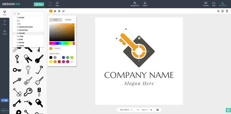 Alternatively, you can save it on your computer directly for immediate use. DesignEvo allows you to download logos in JPG or PNG formats with a maximum resolution of 500 x 500 pixels at ZERO cost.