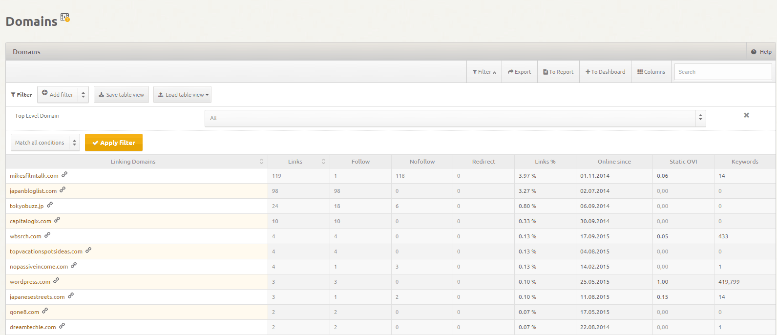 The links analysis gave me an overview of the top level domains, with useful statistics: