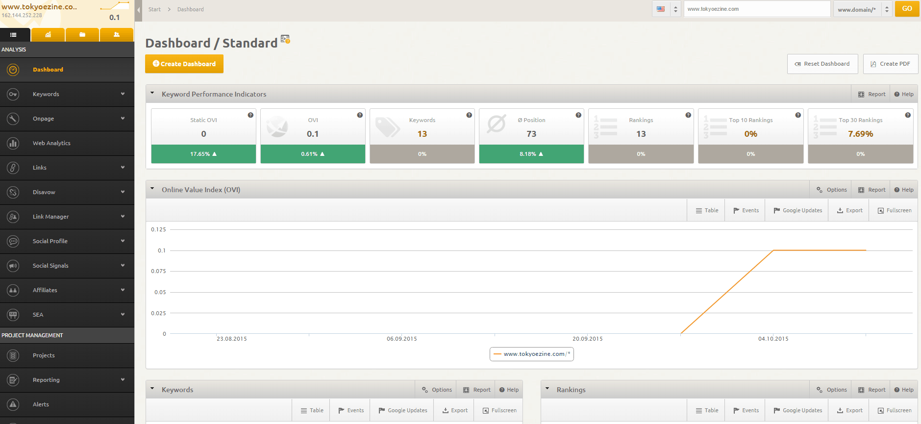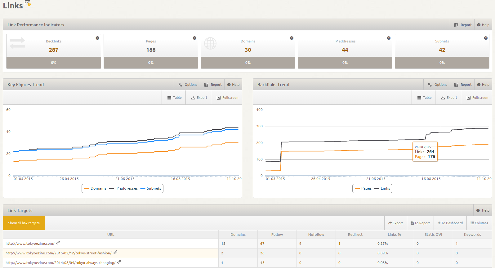 Among the interesting things, I particularly liked the graphics of my key figures and backlinks trends, with the specifics of each link target.