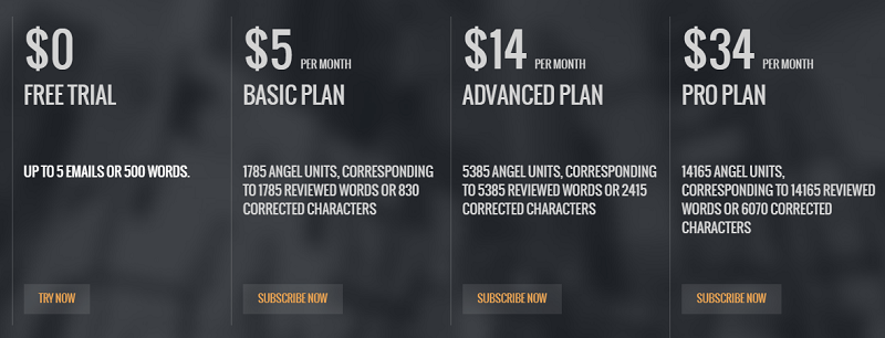 The basic plan ($5/mo) covers 1785 angel units, which corresponds to 1785 reviewed words or 830 corrected characters.