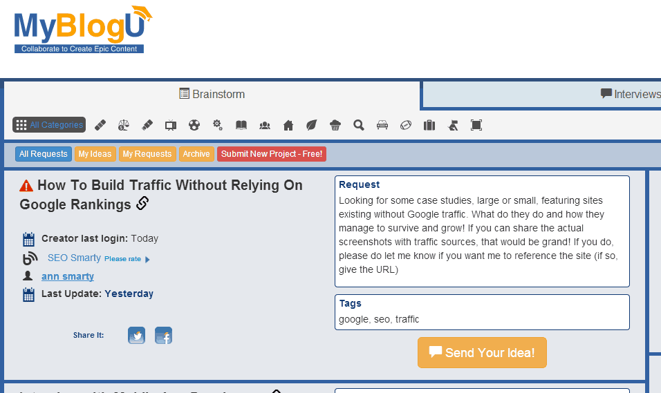Brainstorm is the part of MyBlogU where you can put into your projects in order to request the community help.