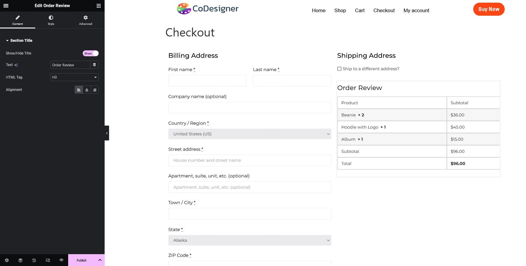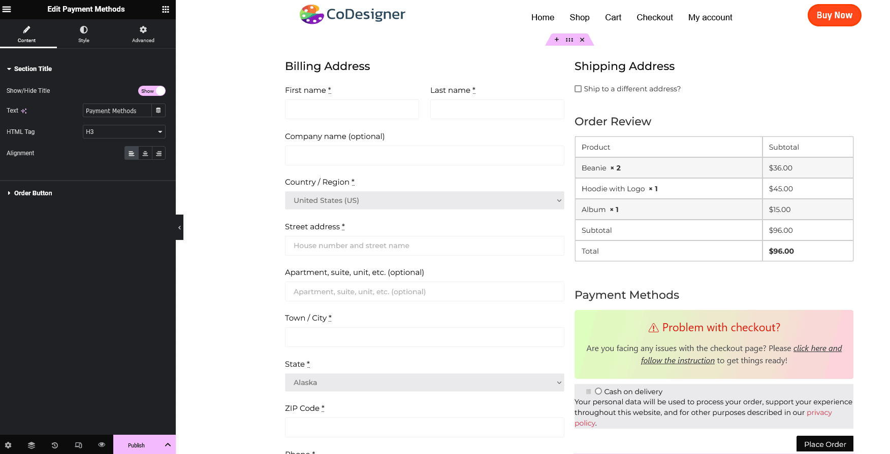 - Remove Unnecessary Fields: You need to arrange the form fields logically and in a user-friendly manner. Remove all the unnecessary fields to make the checkout process easier. In CoDesigner, you’ll be able to remove the additional field showing on your checkout.
